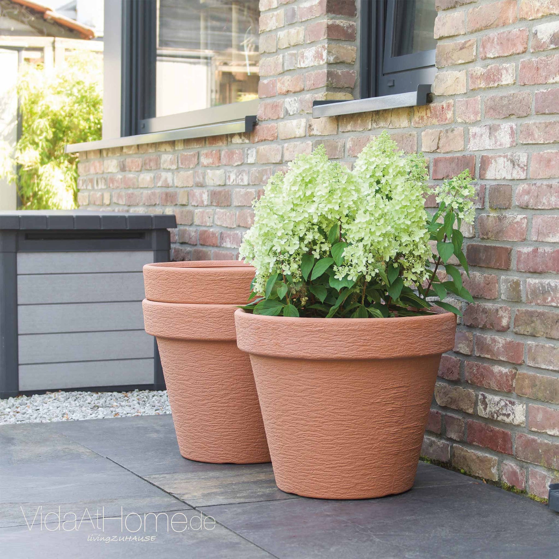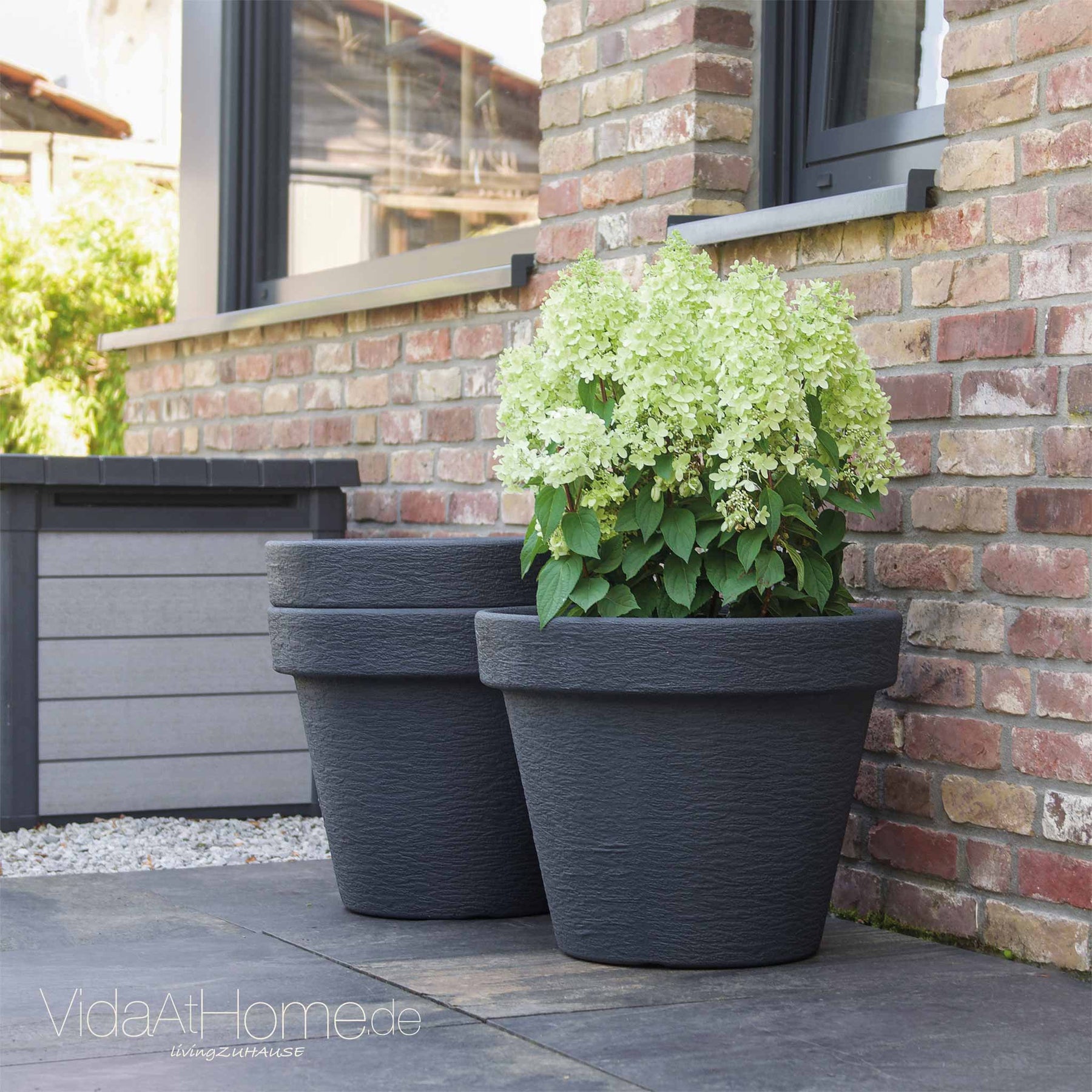 Gefertigt aus wetterfestem Kunststoff, sind die Töpfe UV-beständig, frostsicher und zu 100 % recycelbar. Das robuste Material trotzt jeder Witterung und bleibt dauerhaft stabil. Dank der pflegeleichten Oberfläche lassen sich die Gefäße mühelos reinigen.