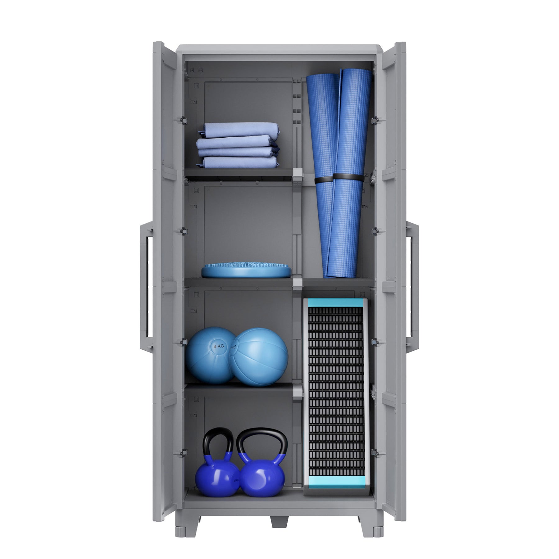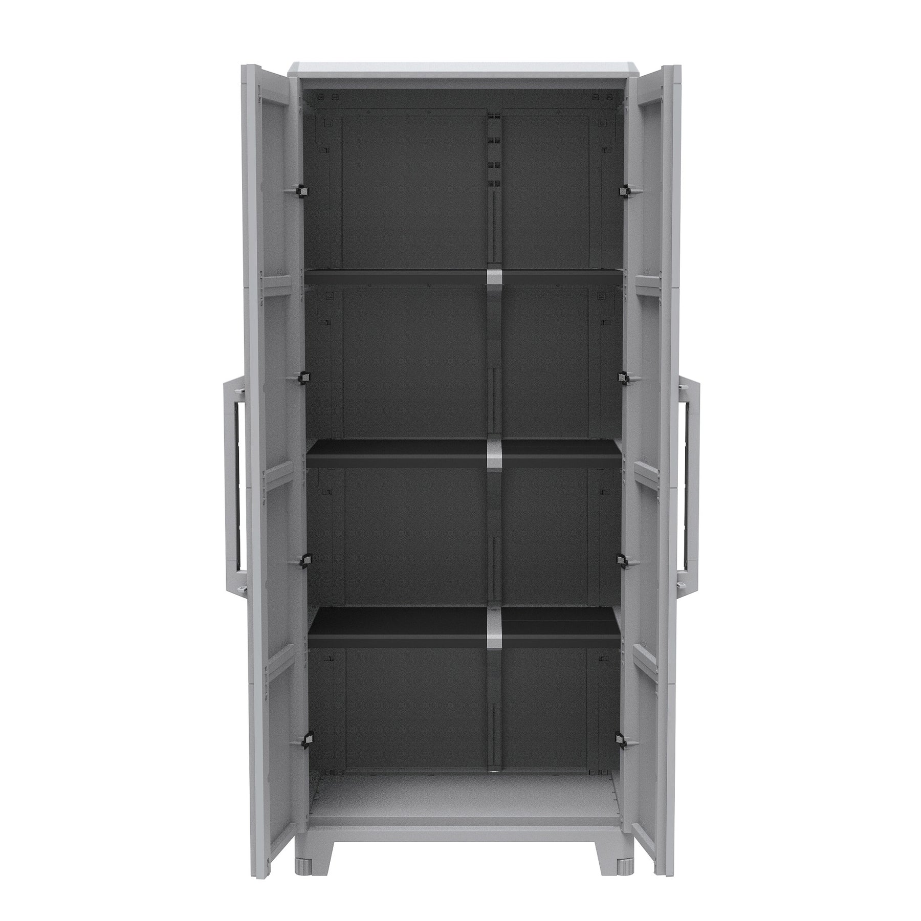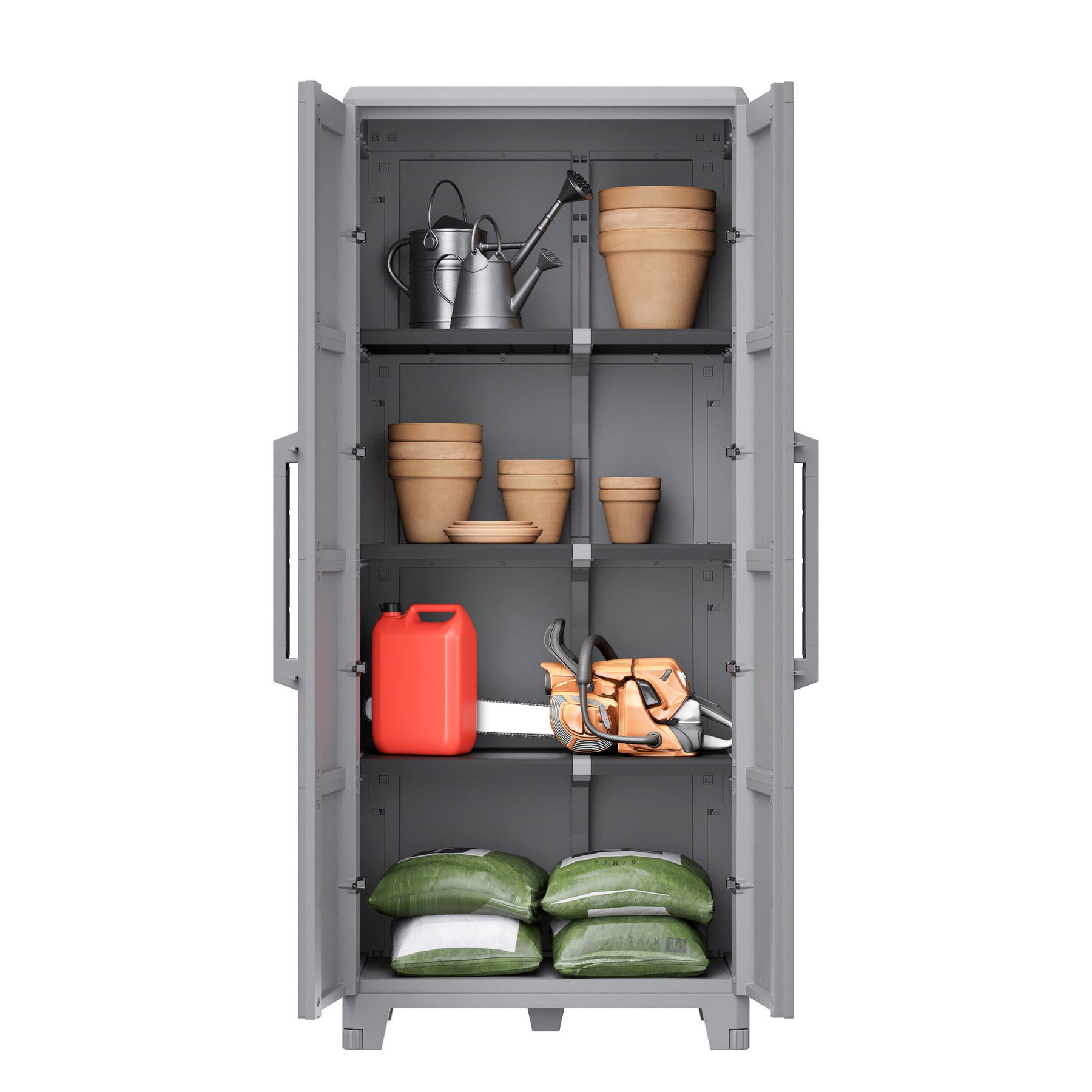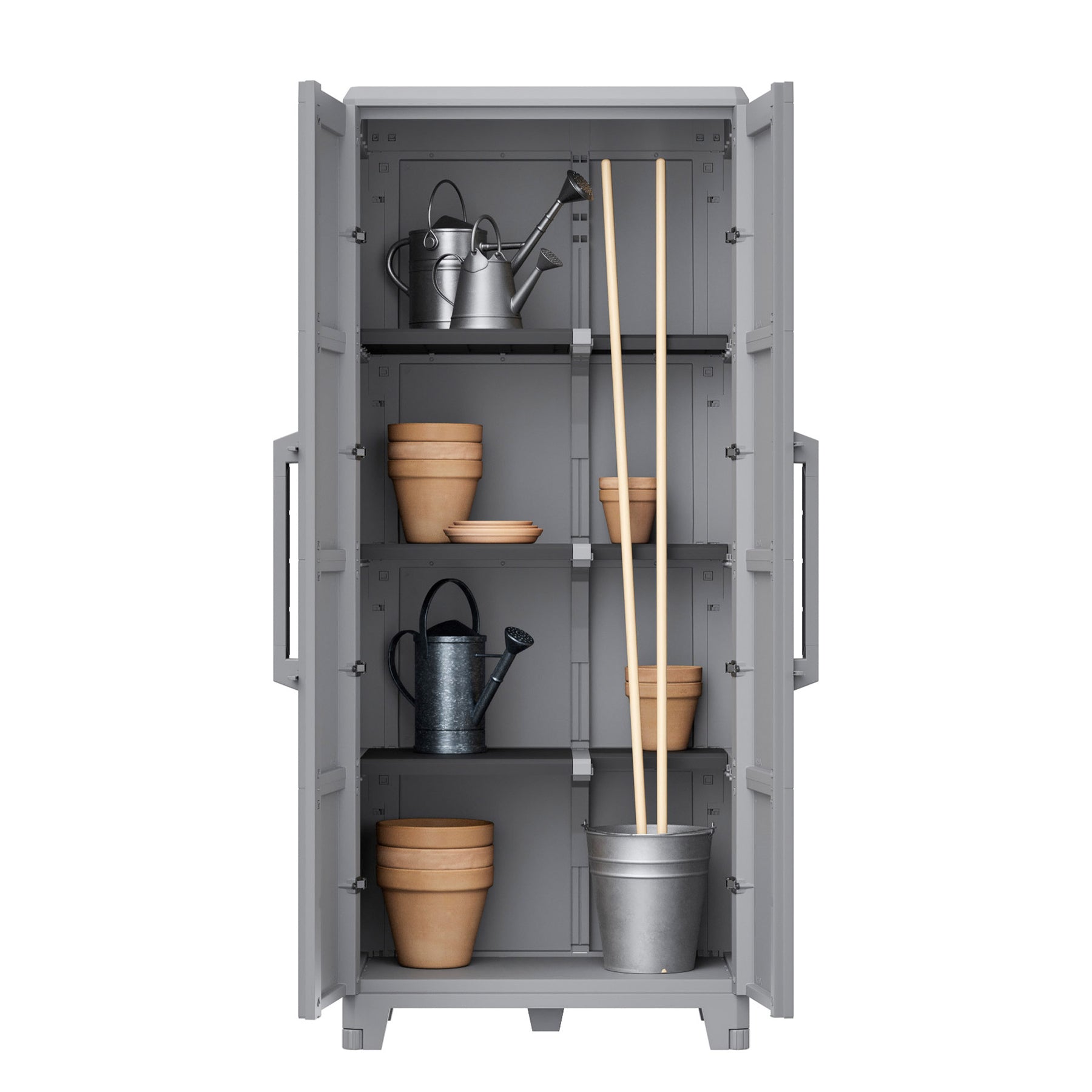 Der TERRY MOD-L kombiniert den MOD-S Basisschrank mit zwei Erweiterungs-Kits zu einer besonders geräumigen Aufbewahrungslösung. Ideal für alle, die Ordnung lieben – ob im Garten, in der Werkstatt, Garage oder auf dem Balkon.