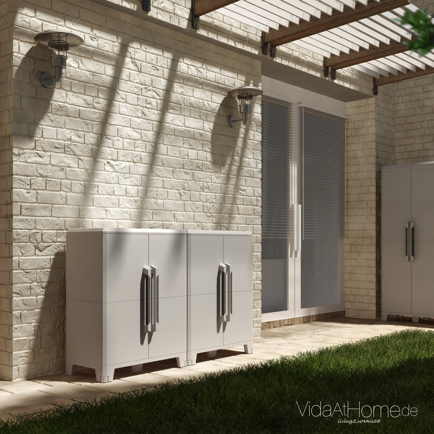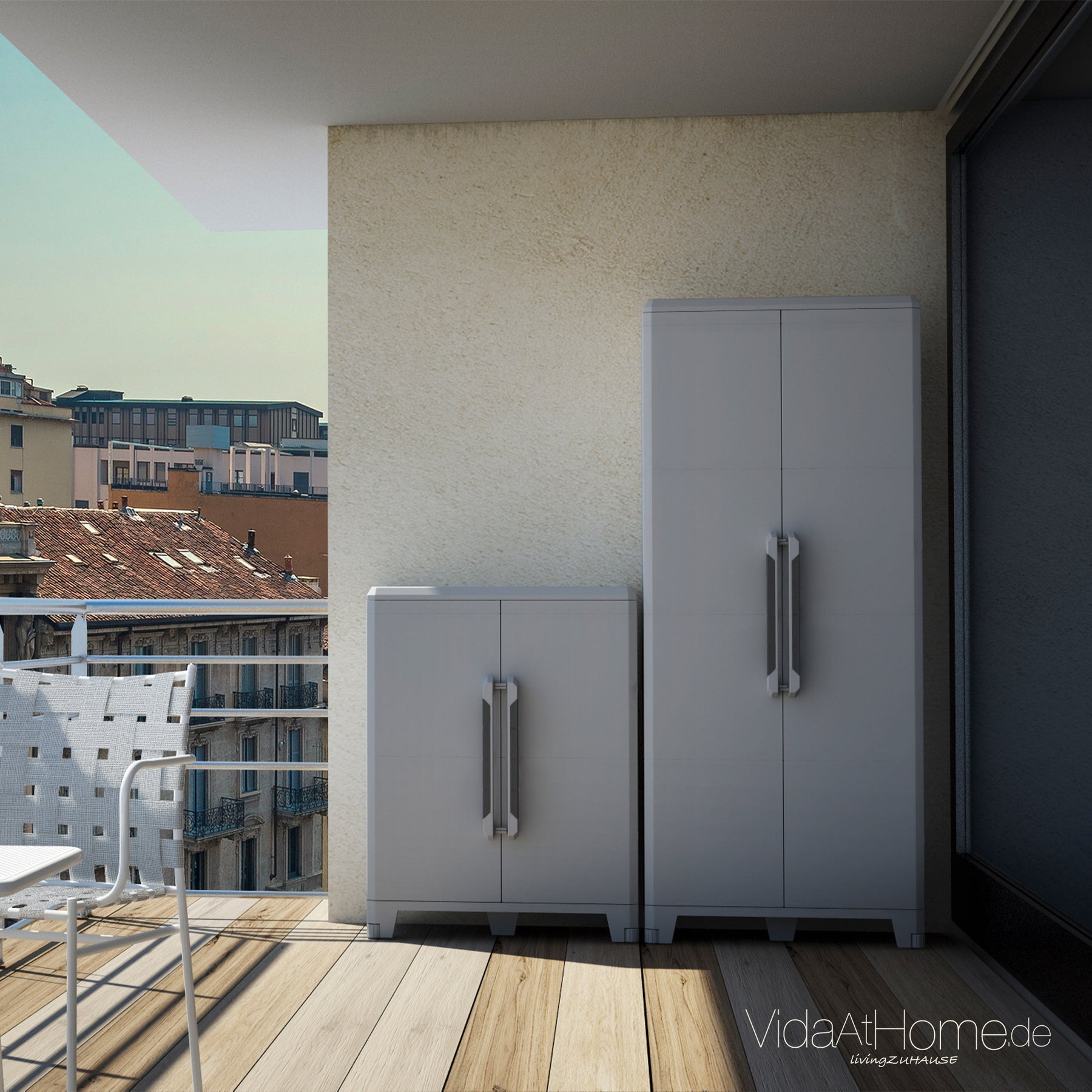 Auch wenn das Material UV-beständig ist, solltest Du den Schrank nicht dauerhaft direkter Sonneneinstrahlung aussetzen. So verhinderst Du Ausbleichen oder Versprödung.