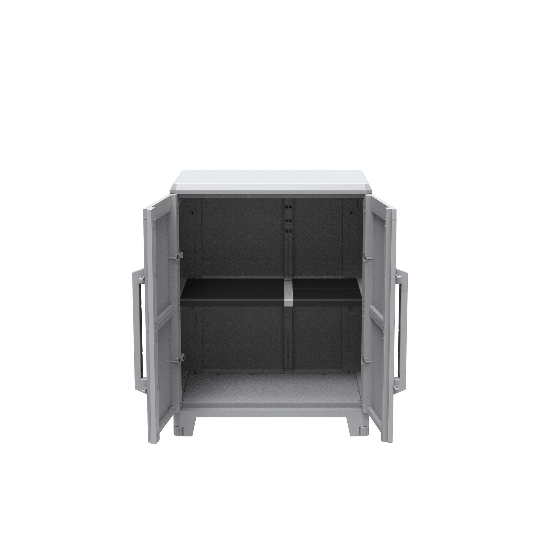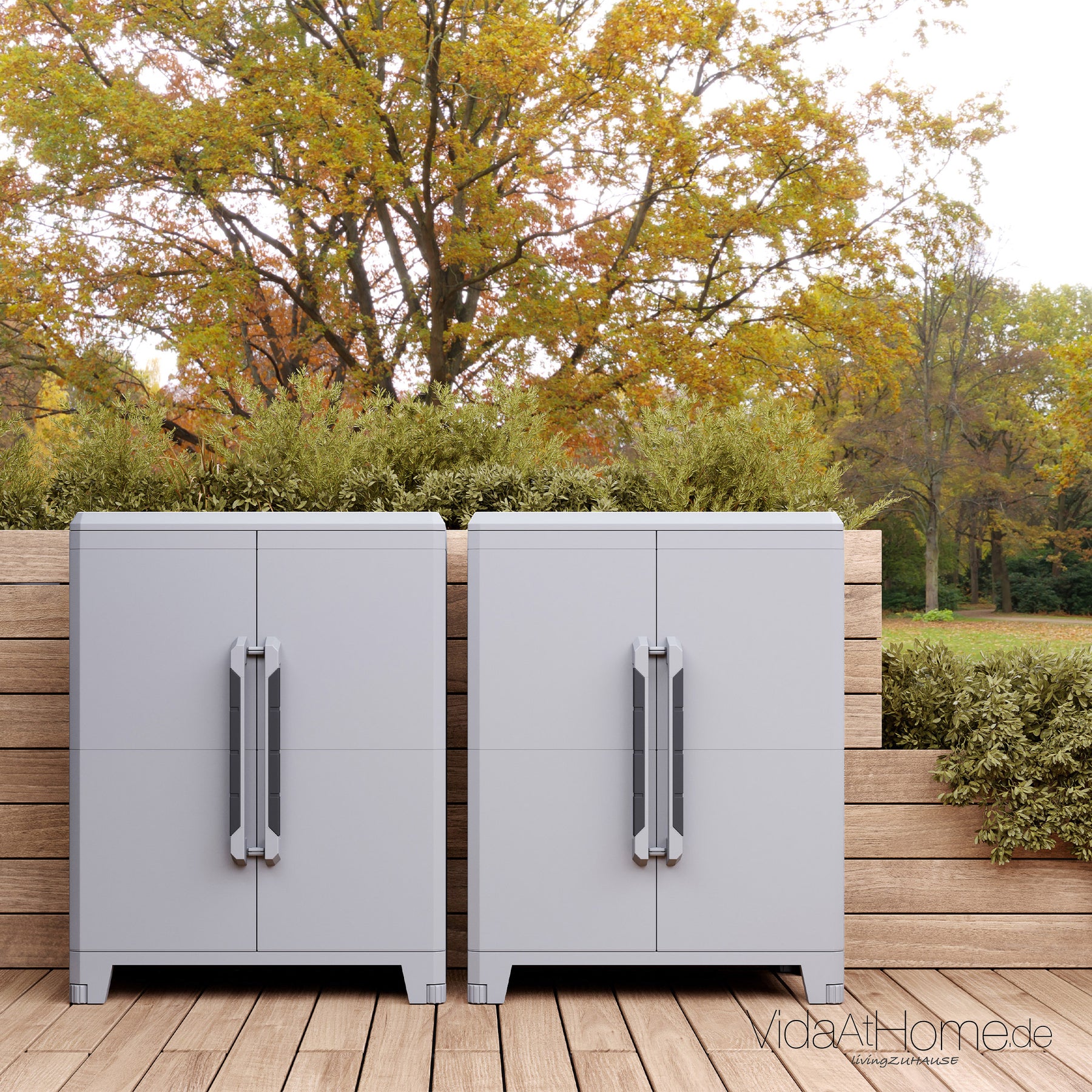 Der Schrank ist GS-zertifiziert und erfüllt die IP43-Schutzklasse – er ist also regendicht und bestens für den geschützten Außenbereich geeignet. Stabile Metallscharniere sorgen dafür, dass sich die Türen nicht ungewollt öffnen. Und dank höhenverstellbarer Füße steht der Schrank auch auf unebenem Boden zuverlässig und sicher.